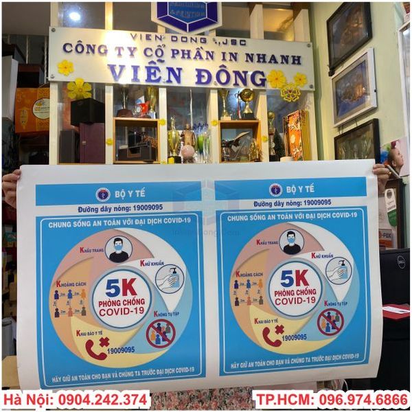 Poster 5K chính là một loại poster được in trên một tấm decal và được dùng để dán lên tường tại các nơi công cộng hay có đông người qua lại. Trên poster sẽ được in 5 thông điệp mà bộ y tế muốn người dân phải thực hiện để phòng tránh dịch hiệu quả hơn. Để phòng chống dịch được tốt hơn thì hiện nay Xưởng In Nhanh Viễn Đông chúng tôi cũng đã cho in poster 5K để giúp mọi người dân thực hiện đúng theo yêu cầu của bộ y tế và chính phủ cũng như nâng cao ý thức cảnh giác với dịch bệnh. Tại đậy thì các poster 5K sẽ được chúng tôi in và sản xuất trên công nghệ in offset cao cấp hiện đại, In nhiều màu 1 hoặc 2 mặt nhưng thường thì ta sẽ in 2 màu,4 màu, 2 mặt. Ngoài ra thì sản phẩm sẽ được cắt xén cán mờ hoặc cán bóng.