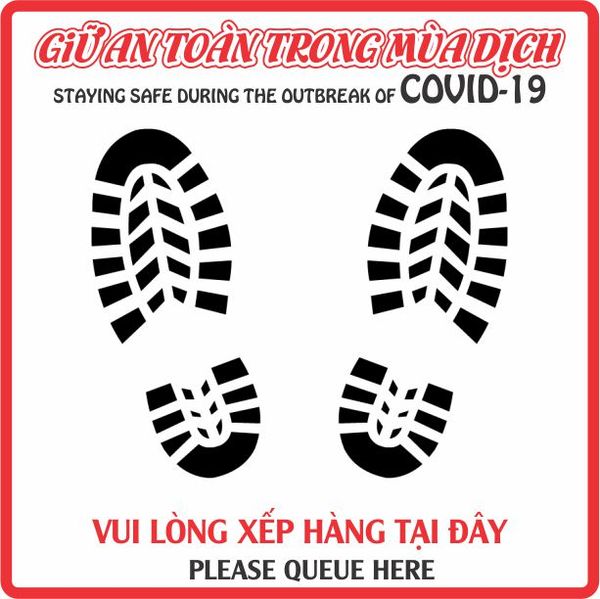 Đặt hàng ngay miếng đề can dán sàn ngay bây giờ và nhận nó ngay trong ngày. Bạn chỉ việc bóc ra và dán xuống sàn để đánh dấu chỗ đứng hay xếp hàng. Biện pháp này đảm bảo rằng khách hàng hay nhân viên của bạn giữ một khoảng cách thích hợp từ 1.5 - 2m để chống lây lan Virut khi tiếp xúc gần.