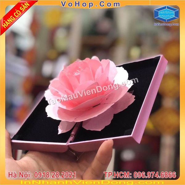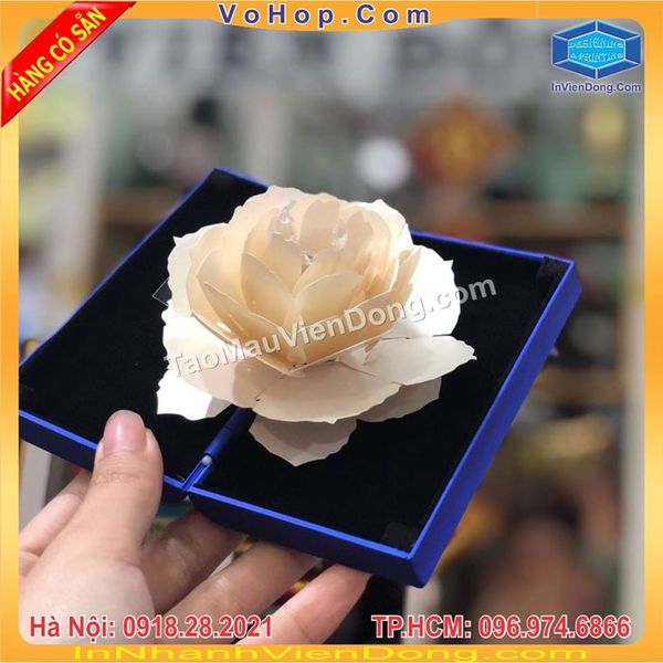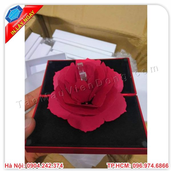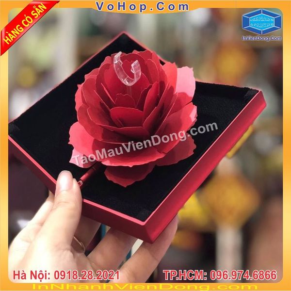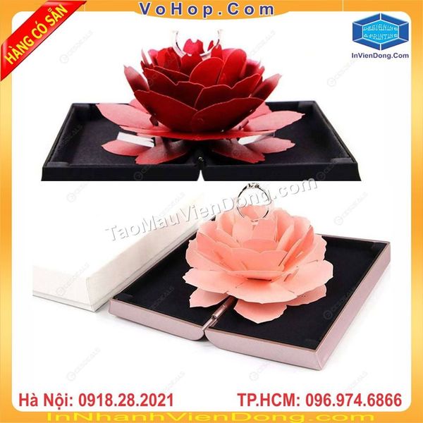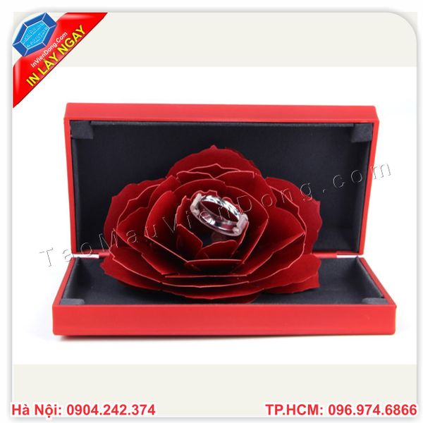 Hiện tại công ty in Viễn Đông chúng tôi có rất nhiều mẫu mã và hàng bán sẵn những kiểu hộp đựng nhẫn đẹp và sang trọng đang được rất nhiều người ưa chuộng và hot trend nhất hiện nay như hộp hoa hồng đựng nhẫn,… Hộp hoa hồng đựng nhẫn được làm từ chất liệu bìa carton lạnh mạng lại độ cứng và bền, sang trọng bên ngoài được bọc nỉ, da hoặc nhung. Bên trong thì được thiết kế tỉ mỉ tinh xảo vơi những cách hoa hồng bằng nhung khi mở ra tạo sự bất ngờ lãng mạng và ấn tượng cho người nhận.