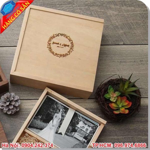 Hộp gỗ đựng ảnh cưới: Được làm từ gỗ tự nhiên hoặc gỗ nhân tạo, thường có thiết kế sang trọng, tinh xảo. Hộp gỗ thường được trang trí bằng hoa văn chạm khắc hoặc sơn mài tạo điểm nhấn hấp dẫn.