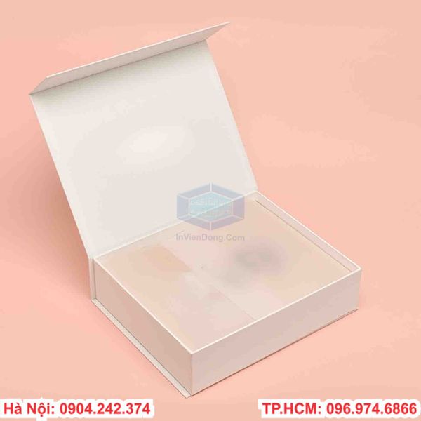 Hộp hít nam châm là dạng hộp bìa cứng chuyên được sử dụng cho các sản phẩm cao cấp và có giá trị. Với thiết kế tinh tế, thể hiện sự sang trọng và cao cấp, các sản phẩm hộp hít nam châm đòi hỏi thiết kế in ấn và gia công rất tỉ mỉ.