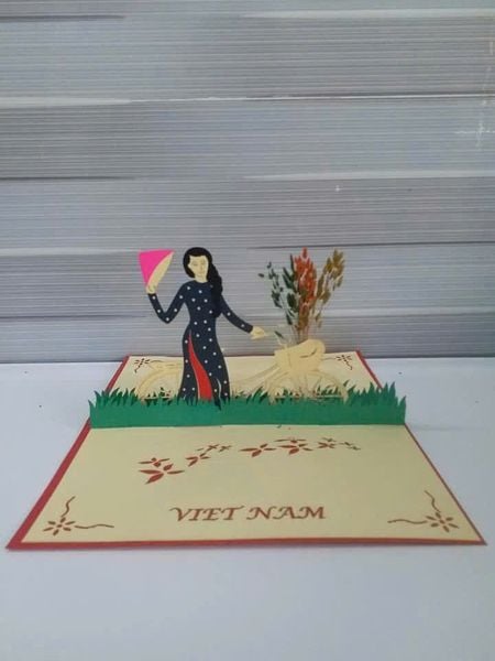 Chất lượng vượt trội: Cắt laser siêu nét trên nền giấy mỹ thuật cao cấp (màu ngà vintage/kem), kết hợp viền đỏ nổi bật. Dòng chữ "VIET NAM" được cắt lọng tinh tế ở phần đế thiệp.
