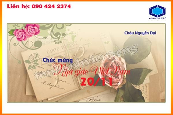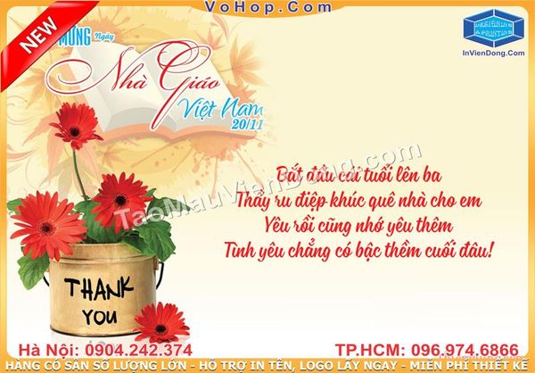 Ngày nhà giáo việt nam 20-11 là một ngày đặc biệt đối với học sinh và cả các thầy cô giáo.Bên cạnh những bó hoa tươi thắm thì cũng không thể thiếu những tấm thiệp cùng những lời chúc mừng .Việc bạn muốn tìm cho mình những tấm thiệp đẹp hãy đến Cty In Nhanh Viễn Đông chuyên In Thiệp Chúc Mừng các loại .