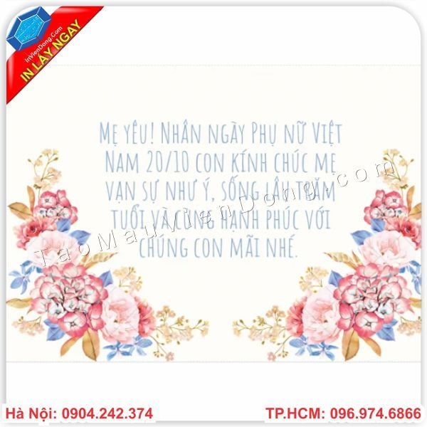 Chuẩn bị chào mừng ngày phụ nữ Việt Nam 2018 IN NHANH VIỄN DÔNG chia sẻ tới mọi người 200 mẫu in thiệp chúc mừng ngày phụ nữ Việt Nam 20/10 đẹp và ý nghĩa được chúng tôi tuyển chọn. Cùng lựa chọn những bức thiệp ấn tượng để gửi tới các bà, mẹ, .. trong ngày 20/10 kèm thêm vài lời chúc hài hước chắc chắn sẽ là món quà đầy ý nghĩa. Những mẫu thiệp chúc mừng ngày 20/10 kèm những lời chúc đầy ngọt ngào, đặc biệt, yêu thương dành cho phái đẹp của công ty IN NHANH VIỄN ĐÔNG đang được cộng đồng mạng tìm kiếm và sử dụng rất nhiều Ngày 20/10 hàng năm là ngày cả nước ta hân hoan kỷ niệm ngày Phụ Nữ Việt Nam. Những công sức, những giọt mồ hôi của Bà, của Mẹ, của các chị ... đều được chúng ta tôn vinh bằng tất cả tấm lòng, trái tim của mình. Hòa chung không khí đó, tại sao chúng ta lại không tặng cho Bà, mẹ và các chị ... tấm thiệp 20/10 là những tấm thiệp chúc mừng 20/10 đẹp và ý nghĩa nhất Một tấm thiệp 20/10 cũng đủ làm cho người phụ nữ yêu thương nhất của bạn trở nên thấy hạnh phúc hơn bao giờ hết trong ngày đặc biệt này. Với một tấm thiệp cùng những lời chúc 20/10 ý nghĩa, không khó để có thể tìm thấy tại các cửa hàng hiện nay, nhưng để có được những tấm thiệp ưng ý đẹp mắt thì hãy nhanh đến với chúng tôi tại IN NHANH VIỄN ĐÔVăn phòng & Showroom TP. Hồ Chí Minh 405 Nguyễn Thái Bình, Phường 12, Q. Tân BìnhĐiện Thoại: (028) 6277 8018 Báo giá: 0969 746 866 (Zalo - Viber)Hotline: 0981.82.2021 (24 / 7) Email: HCM@innhanhviendong.vn Trụ sở chính tại Hà Nội: Số 5, ngõ 178 Tây Sơn, Đống Đa, Hà Nội Hotline: 0904 242 374 (Imessage) Email : innhanhviendong@gmail.com(Cạnh Gò Đống Đa - Đối diện Đại Học Công Đoàn) ĐT: (024) 3857 0613 Báo giá: 0918.28.2021 (Zalo | Viber ) Xưởng Sản Xuất: Số 45/178 Tây Sơn, Đống Đa, HN (Có chỗ đỗ ôtô) ĐT: (024) 3537 6394 Email : congtyviendong@gmail.com Hệ Thống Website inviendong.com - invohop.com - printhanoi.com - taomauviendong.com - inthe.com.vn - quatangviendong.com - intuinilon.com - intuigiay.com - invohopquatang.com Ms.Cuc Ms.Phương 0904 90.20.21 Zalo | Viber Ms.Chinh Ms.Chinh 0903 262 242 Zalo | Viber ms. linh Ms.Linh 0904 052 021 Zalo | Viber ms duyen Ms.Duyên 091.335.9119 Zalo | Viber Chúng tôi có đội ngũ nhân viên tư vấn, chăm sóc Khách hàng tại Hà Nội, TP. HCM các tỉnh lân cận! IN NHANH VIỄN ĐÔNG SÁT CÁNH THƯƠNG HIỆU BẠN !!! GỬI THÔNG ĐIỆP Tên Tên Email Email Số Điện Thoại Số Điện Thoại Thông điệp Thông điệp ĐĂNG KÝ Làm thành viên của chúng tôi ngay hôm nay để nhận được nhiều thông tin về các đợt khuyến mại Nhập email của bạn ... TẠI SAO CHỌN CHÚNG TÔI? Công ty In Nhanh Viễn Đông với máy in offset nhanh Siêu tốc, In lấy ngay sau 5 phút, Free thiết kế. Phản ánh chất lượng, sản phẩm dịch vụ, tiến độ sản phẩm liên hệ HOTLINE 0904 242374 để được tư vấn trực tiếp. HỆ THỐNG CỬA HÀNG Số 405 , Nguyễn Thái Bình Phường 12 , Quận Tân Bình + HCM: 096.974.6866 Hcm@Innhanhviendong.Vn Số 5 , Ngõ 178 Tây Sơn , Hà Nội + HN: 0904.242.374 Innhanhviendong@Gmail.Com Mon - Sat: 8:30- 19:00 TỪ KHÓA TÌM KIẾM In Viễn Đông In hộp mỹ phẩm Hộp đựng quà Túi đựng quà In thùng Carton - Hộp carton In tem nhãn - decal lấy ngay thiệp chúc mừng 20/10 thiệp 20/10 đẹp nhất thiệp mừng 8 3 đẹp lời chúc 20/10 ngắn gọn 20/10 là ngày gì vậy ý nghĩa ngày 20/10 ý nghĩa ngày phụ nữ việt nam 20 10 to chuc 20 10 hoa chúc 20 10