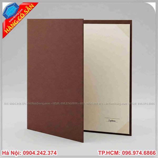 Cung cấp bìa đựng bằng tốt nghiệp cao cấp, chất liệu da/simili, ép kim logo sắc nét. Giải pháp hoàn hảo lưu giữ và tôn vinh bằng cấp. Liên hệ In Viễn Đông 0904.242.374